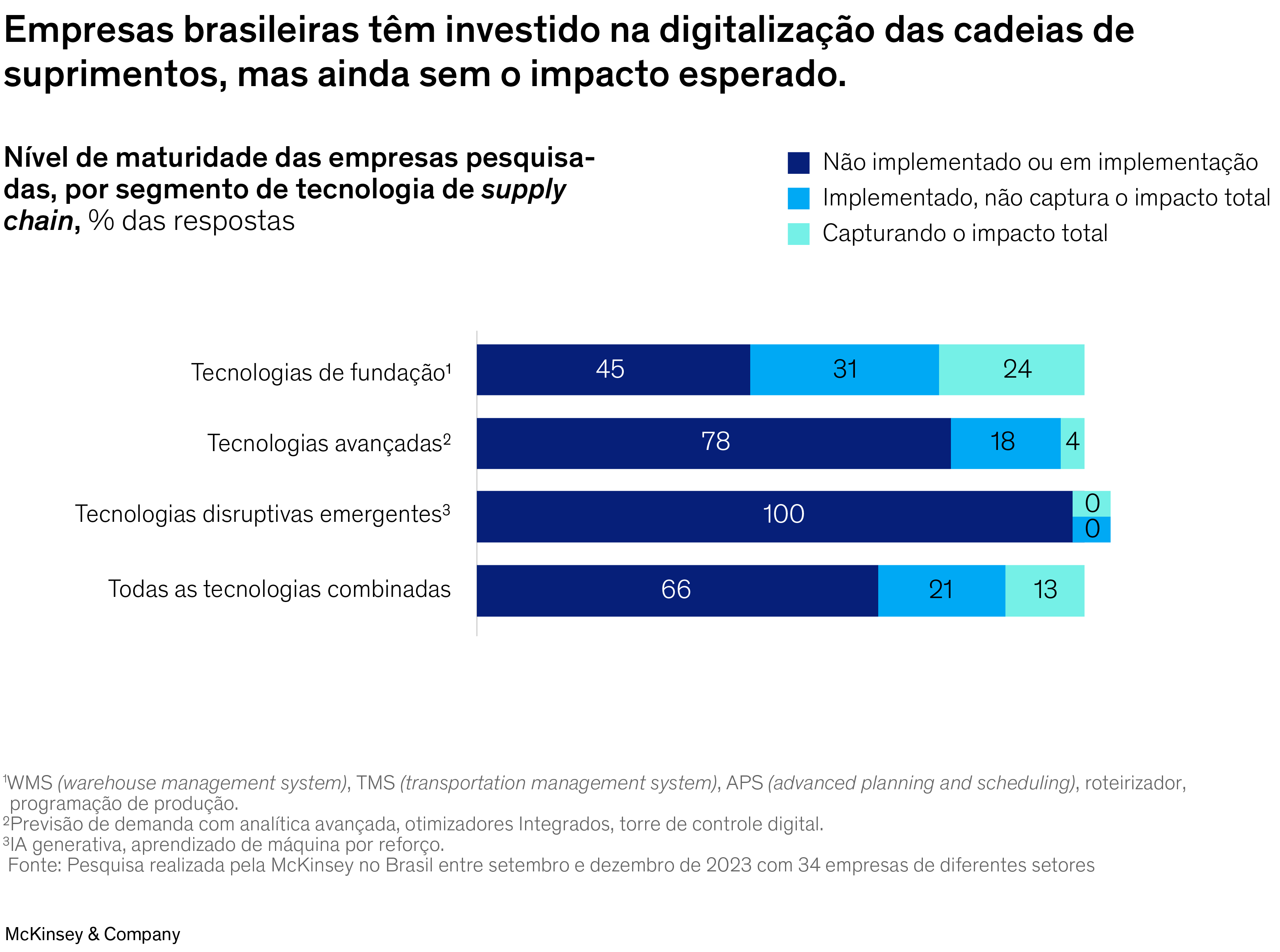 Em um segundo grupo, o de empresas que fizeram investimentos em tecnologias avançadas – aquelas que lidam com alta complexidade e granularidade –, apenas 4% declararam estar conseguindo extrair valor total dessas ferramentas. A categoria inclui mecanismos de previsão de demanda multivariável baseados em aprendizado de máquina (machine learning), otimizadores matemáticos que consideram as múltiplas decisões e trade-offs da cadeia de ponta a ponta e torres de controle digitais.